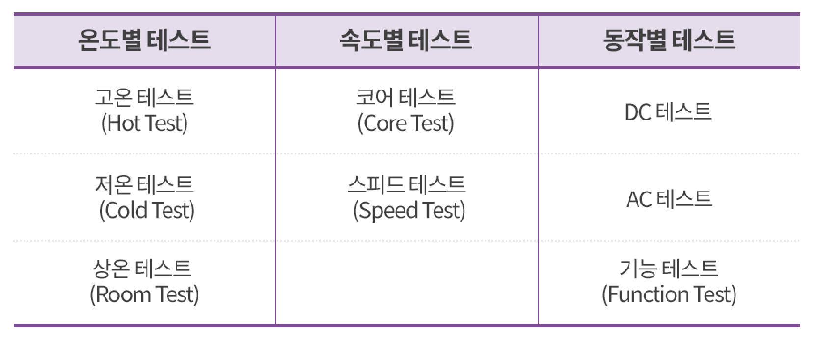 동작별 테스트는 DC 테스트, AC 테스트, 기능 테스트 등 총 3개로 구별할 수 있는데요.