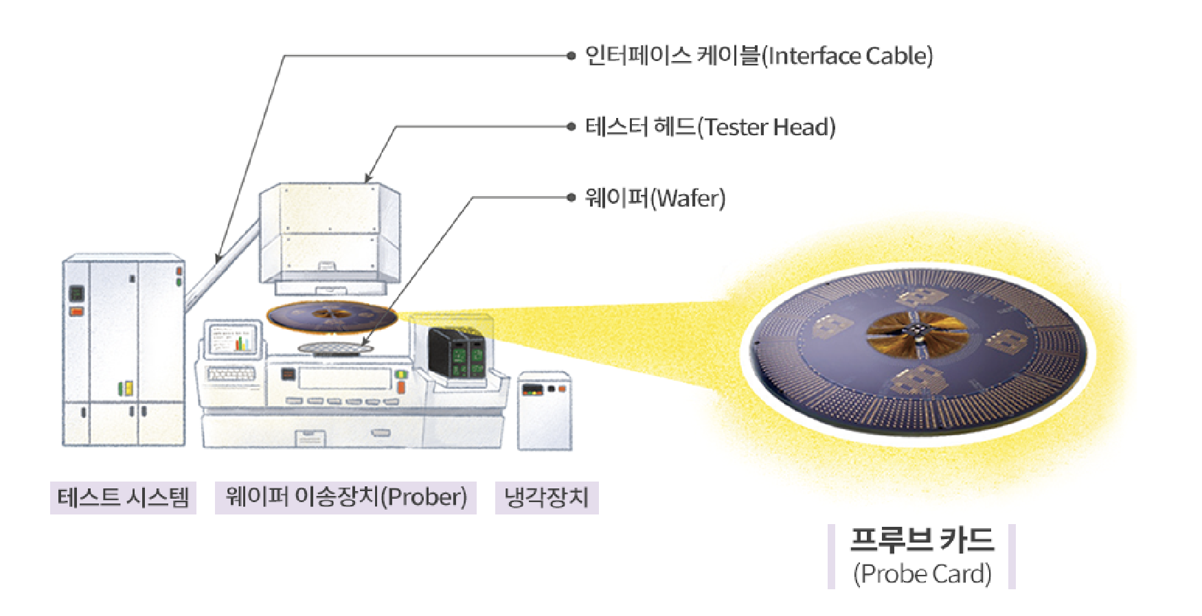 웨이퍼의 전면이 위를 보게 로딩되면 오른쪽의 프루브 카드가 뒤집어지는 형태가 되고
