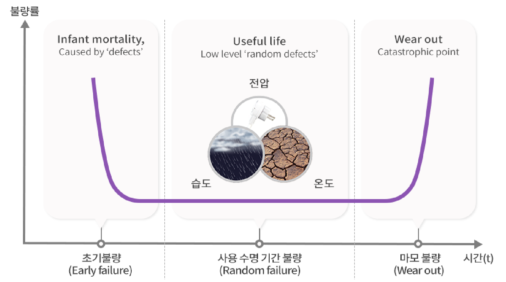 제조 상에서 오는 불량이 사라지면 그 제품의 사용 수명 동안은 불량률이 낮아지게 되겠죠. (Random failure)