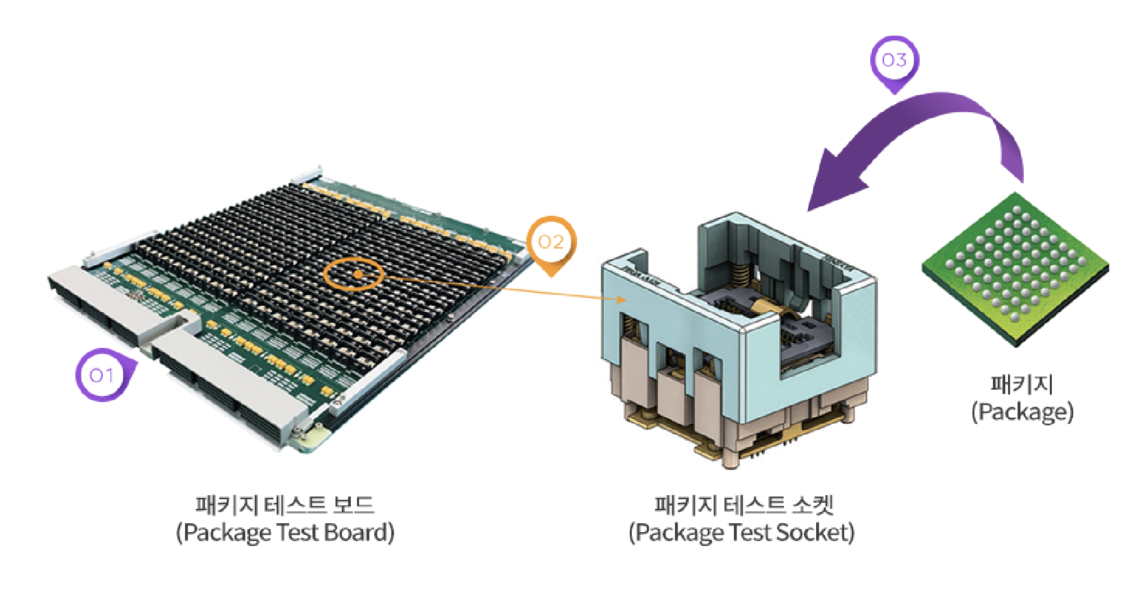 패키지 테스트를 위해서는 먼저 패키지의 핀 (pin)이 아래쪽을 향하도록 패키지 테스트 소켓에 넣어 소켓에 있는 핀들과 물리적으로 접촉하게 합니다. 그리고 이 패키지 소켓을 패키지 테스트 보드에 장착하여 패키지 테스트를 진행합니다.