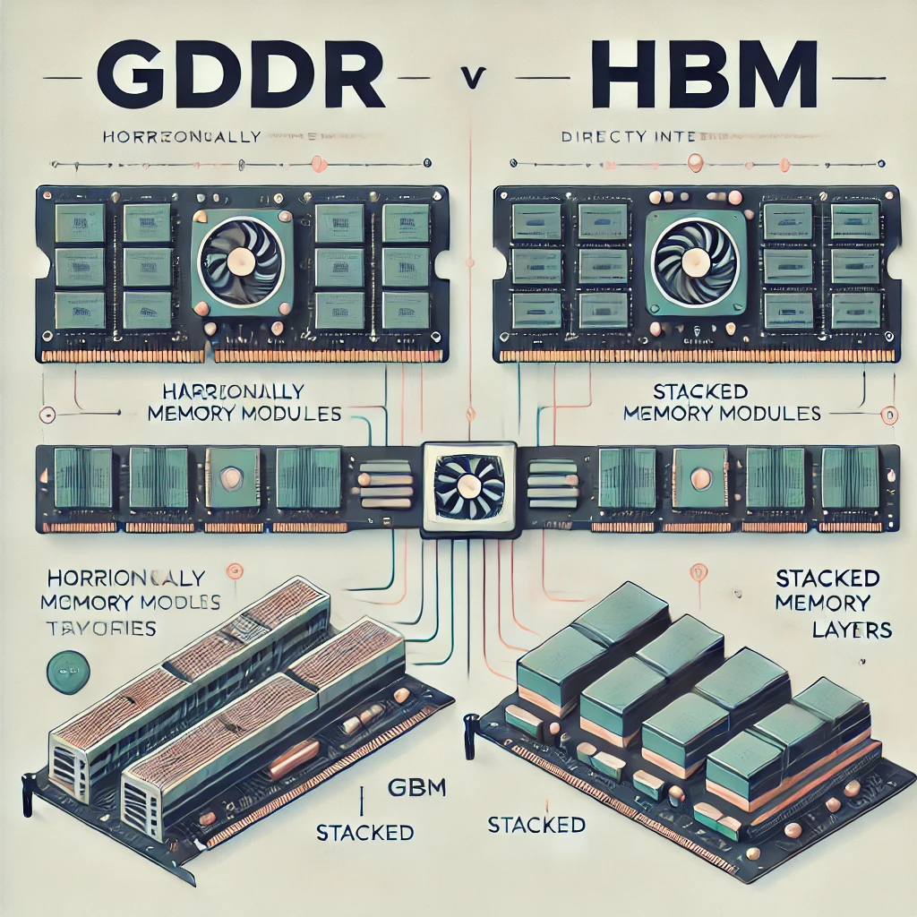 GDDR과 HBM의 가장 큰 차이점은 메모리 배치 방식입니다. GDDR은 GPU와 떨어져 있는 메모리 모듈을 사용하지만, HBM은 GPU 코어에 직접 적층(3D 스택)된 형태로 설계됩니다.